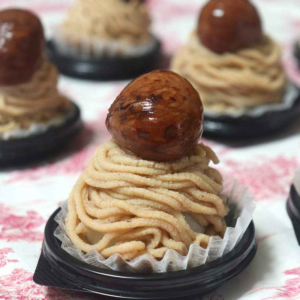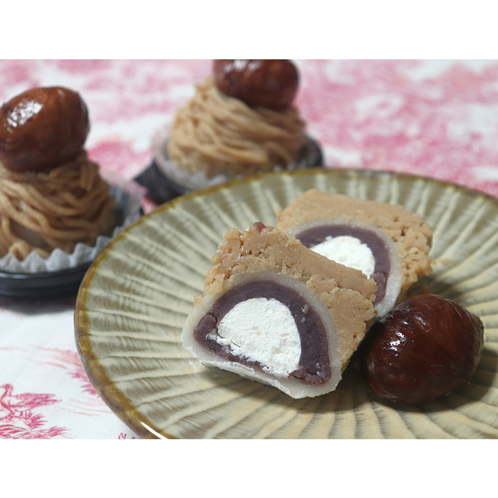 生クリームとこし餡をふわふわ求肥で包み、モンブランケーキのように栗クリームで装飾し、栗の渋皮煮をまるごと1個載せた贅沢な大福です。