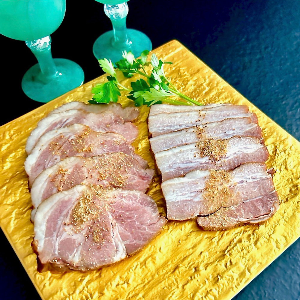 TOKYO Xでお作りした「東京X焼豚」です。味付けに使用した醤油・塩も東京都産。まさにMADE IN TOKYOの焼豚と言えます。肩ロース、バラのセットですので、肩ロース赤身の美味しさ、バラの白身(脂)の驚きうまさを食べ比べしていただき、Xの旨味を実感していただけます。専用のシーズニングソルトを使用していただくと旨味は一層引き立ちます。まさに年末年始にふさわしいローストビーフに匹敵するメインの一皿になります。