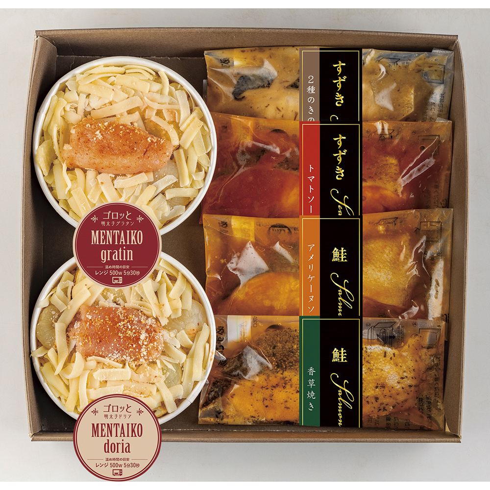 国産のすずき、鮭を使用し洋風に仕上げた焼魚とレンジやオーブンで簡単に食べられるグラタン・ドリアの詰め合わせです。