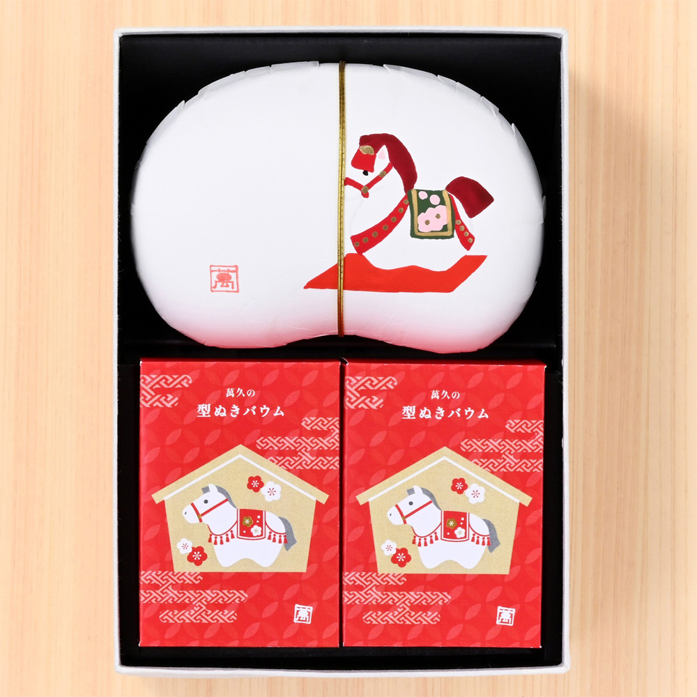 石川・九谷の職人が1点ずつ手描きする豆箱にお入れした紅白の色合いがめでたい豆菓子と、縁起物の絵馬を描いた可愛らしい型ぬきバウムの詰合せ。バウムは絵馬と馬の絵柄に沿って切り抜き加工が施されており、型ぬきを楽しみながらお召し上がりいただけます。