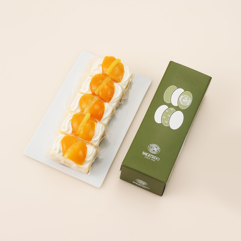 昭和30年に発売されて以来長崎市民に親しまれるレトロなスイーツです。カスタードをサンドした生地に黄桃・パイン・生クリームをのせた、懐かしい味わいが感じられるケーキです。
