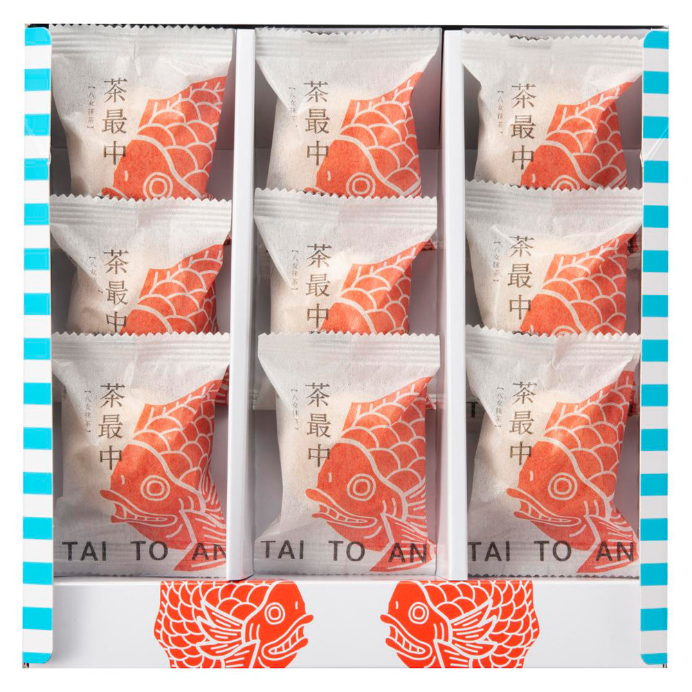 自家製の福岡八女抹茶を使用した抹茶を入れた縁起ものの鯛の形の最中、お口に入れると風味豊かに広がる八女抹茶の香りとさっくりした最中の皮が絶妙にマッチした一品です。