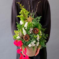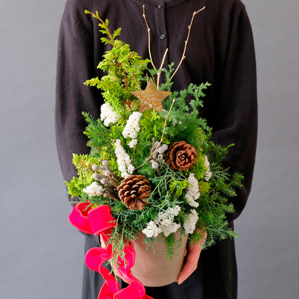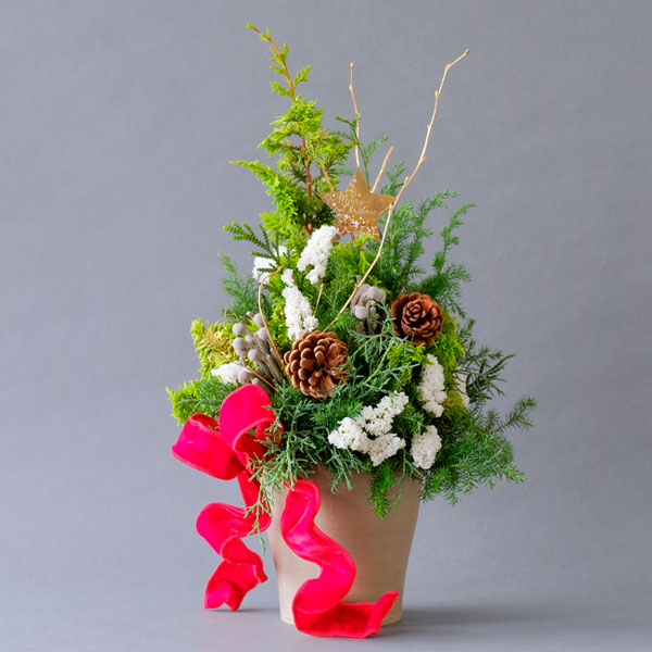 飾りやすいサイズのツリー型アレンジメント。フレッシュならではの針葉樹の香りとともにお楽しみいただけます。枯れにくい素材と、ドライになっても変わらぬ美しさを保つ花や実を使用していますので、クリスマスまで長くお楽しみいただけます。(保水をしなければドライになっていきます。)