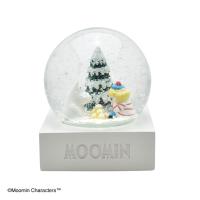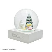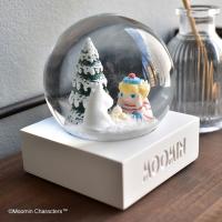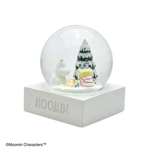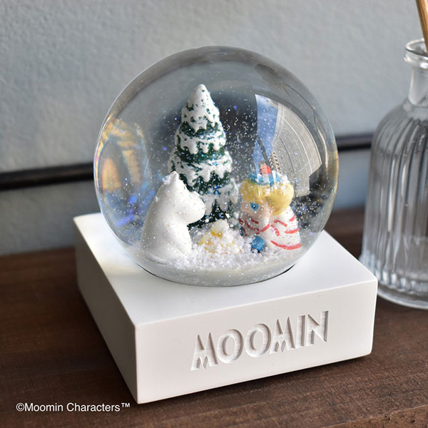 ムーミンとトゥーティッキが雪玉を囲み、その周りを雪がふわふわと舞っています。手のひらに乗せられるほどの大きさで、デスクや棚に飾りやすいサイズ感も嬉しいポイントです。白の台座にロゴを彫り込むことでスッキリとした印象に仕上がりました。