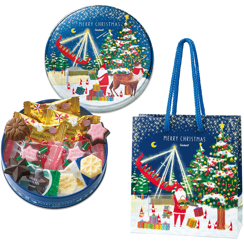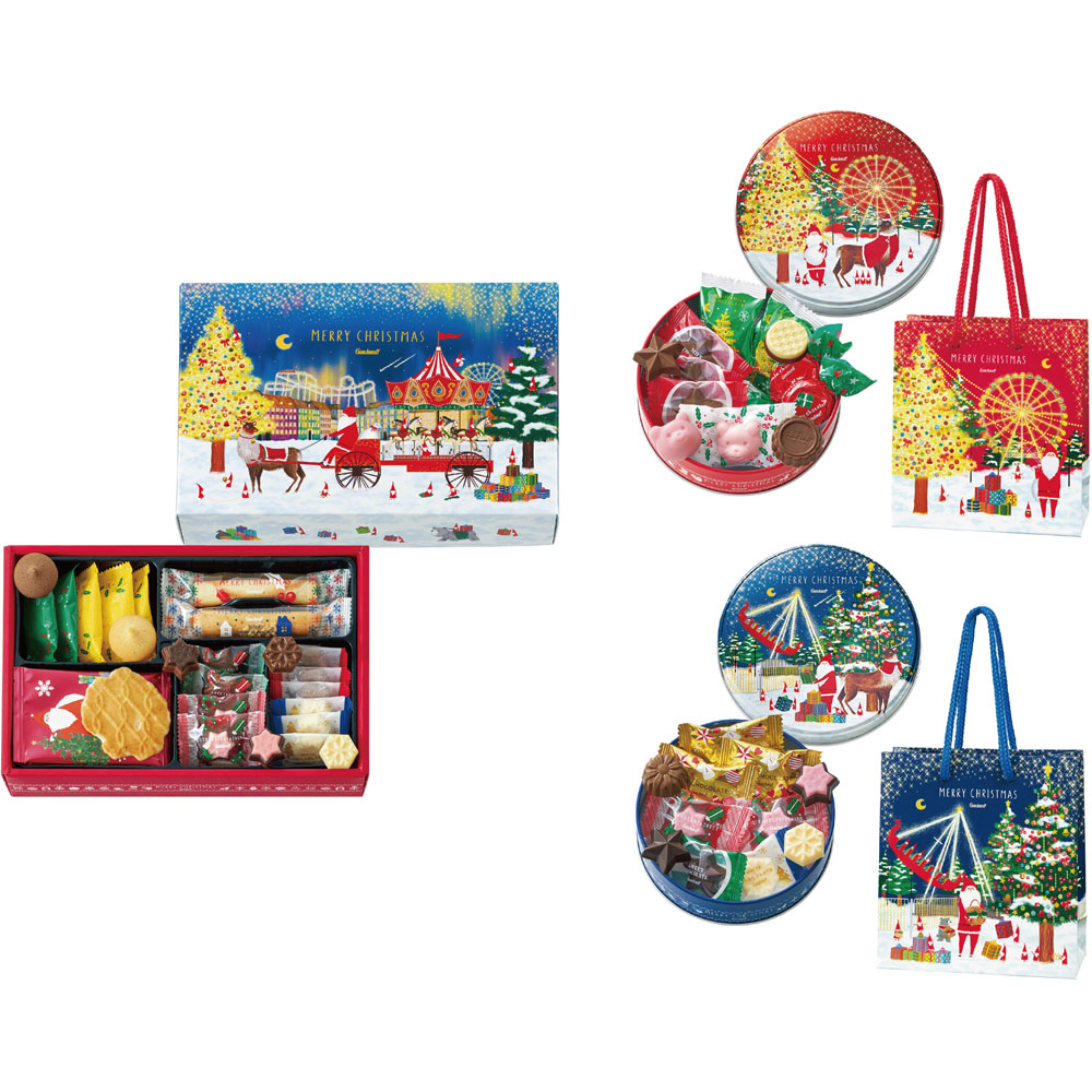 クリスマス限定のデザインパッケージにチョコレートと焼菓子を詰め合わせた「クリスマスアソートギフト」と、チョコレートが入った可愛い丸缶2種、合計3点セットです。