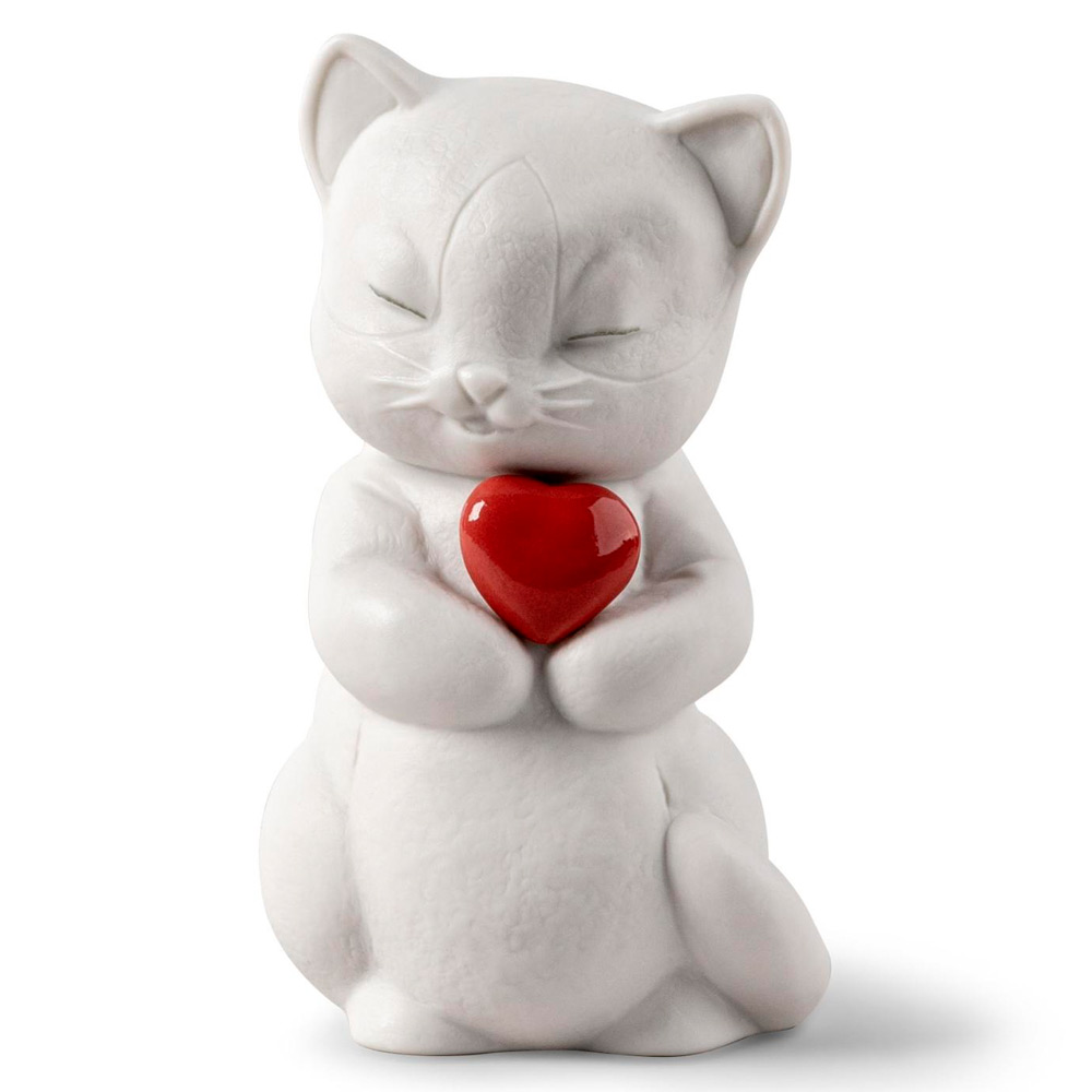 手作りで赤く手塗りされたハートを抱く、ポーセリンのネコ。