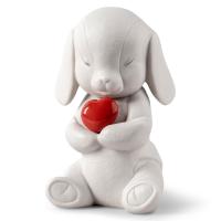 手作りで赤く手塗りされたハートを抱く、ポーセリンのイヌ。
