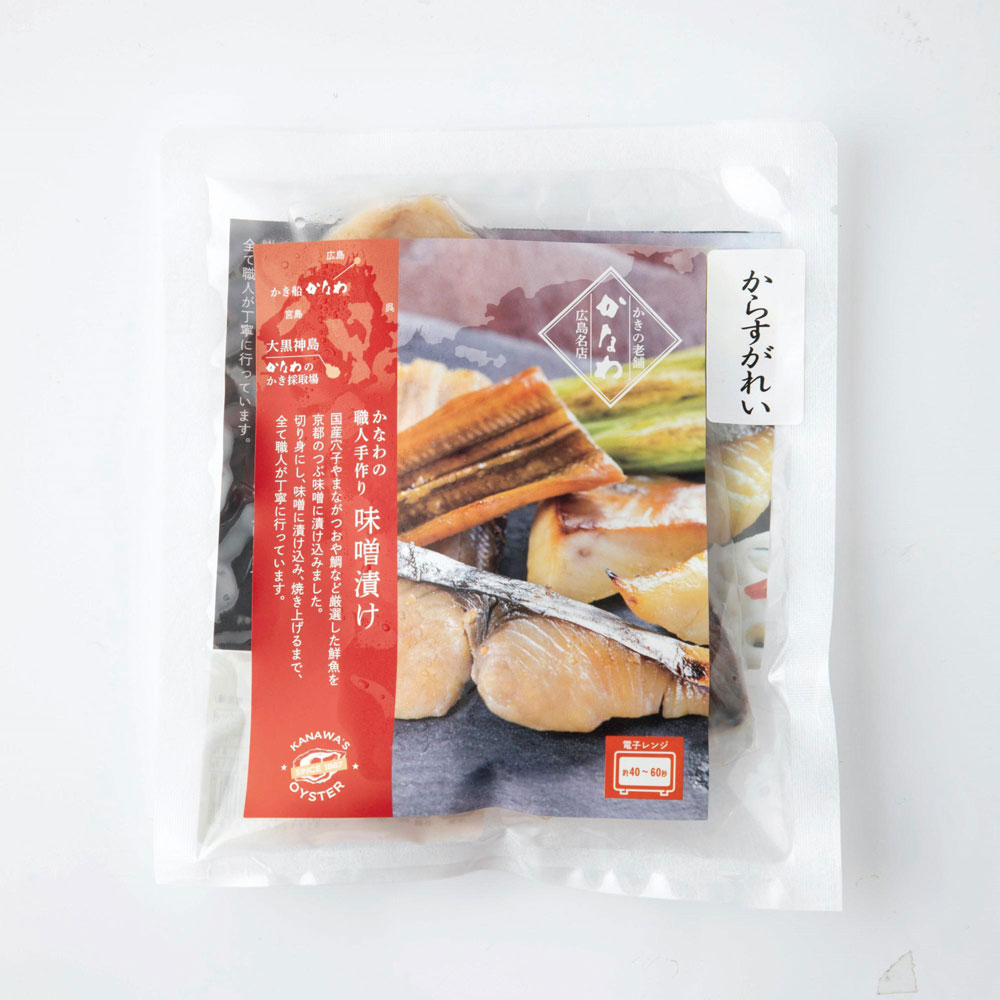 味噌漬け鯛×2、味噌漬けカラスガレイ×2、かきご飯の素×1、かきフライ×1、かきチーズ×1、かきの燻製オイル漬け×1、冷凍生食用かき×1