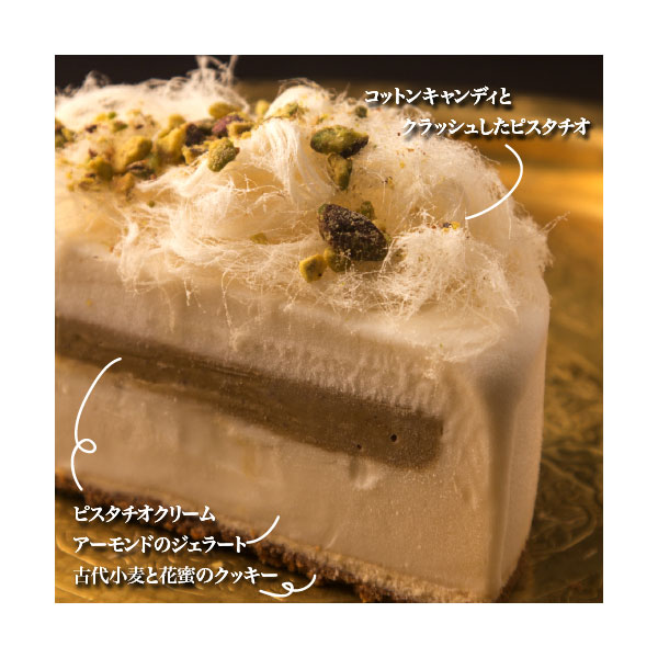 【こちらの商品はアイスケーキです。解凍せずそのままお召し上がりください。】レバノン山脈に降り積もる白い雪をジェラートとアラブの綿菓子”ガザル・エルバネ”で表現した、レバノン・ベイルート発祥のデザート。ホワイトアーモンドの上品な真っ白なジェラートに、濃厚なピスタチオクリームをあわせました。お手元に到着後、お客様ご自身でガザル・エルバネをデコレーションしていただき、ふわふわの食感をお楽しみください。