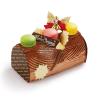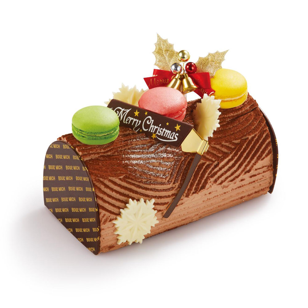チョコレートクリームと、ヘーゼルナッツとアーモンドのジャンドゥヤをサンドしました。カラフルなマカロンが楽しい薪の形のクリスマスケーキ