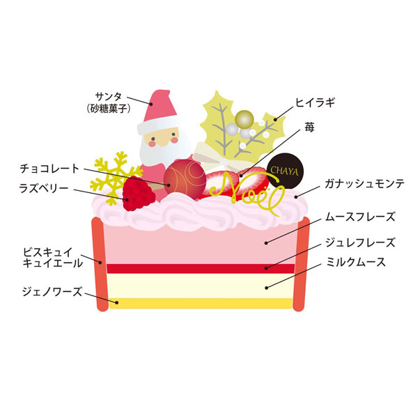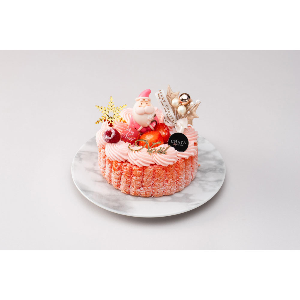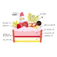 苺の滑らかなムースに甘酸っぱい苺のジュレ、コクのあるミルクムースで仕上げました。ふんわりピンクのビスキュイ生地でムースを包み、たっぷりのクリームと苺・ラズベリーで可愛らしく彩られたクリスマス限定ケーキです。