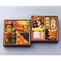 【一の重】めかじき照焼、帆立煮、蛸煮付、絹さや、玉子焼、海老の艶煮、若桃甘露煮、わかさぎの和風揚げ、きんぴら揚げ、生姜辛煮、まぐろ昆布、胡麻わかめ、紅白なます、鱒いくら、黒豆、金柑甘露煮【二の重】蓮根煮、椎茸煮、牛蒡煮、里芋煮、もち玉すだれ、胡麻団子、山くらげ、若鶏二色巻、数の子、はすの芽わさび風味、紅白蒲鉾、白いんげん豆のきんとん、鰊昆布巻、つとぶ煮、筍煮