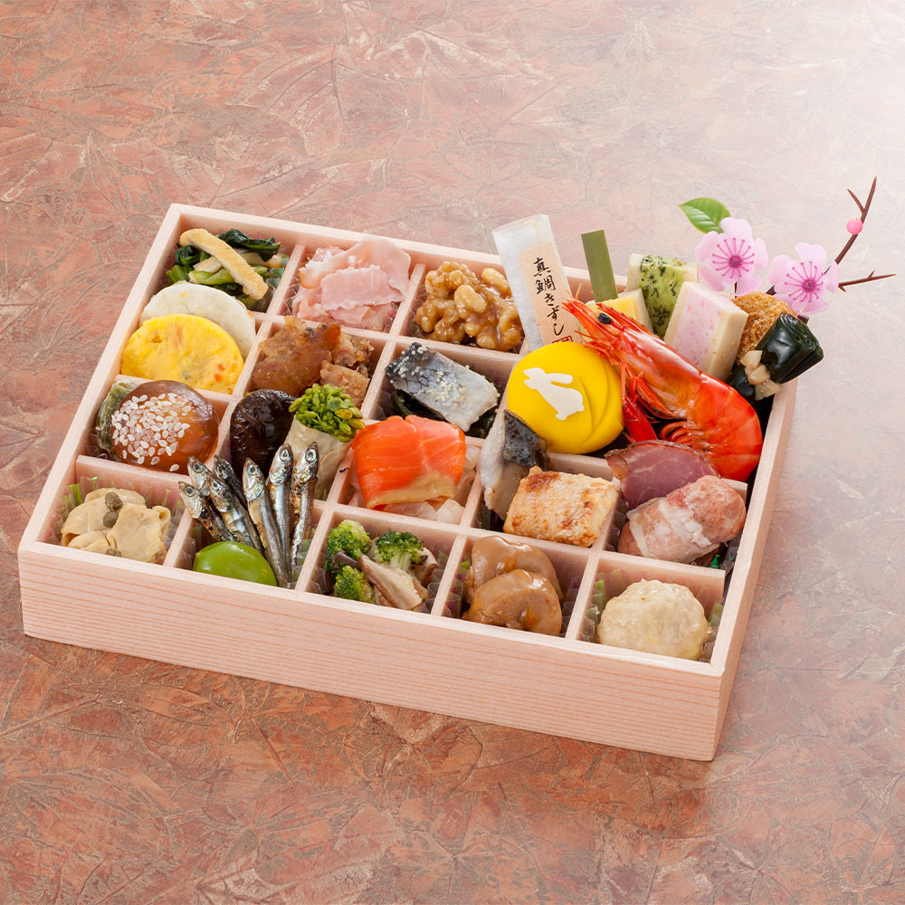 【一の重】小松菜と揚げ煮物、パストラミベーコン、くるみ甘露煮、真鯛きずし、柚子味噌田楽、味付高野(海老)、味付高野(ほうれん草)、たらこ旨煮、一口昆布巻、海老旨煮、月うさぎ(練きり)、豆乳野菜彩り真薯、豆乳野菜ふわふわ真薯、丸穴子南蛮、糸昆布酢炊き、にしん黄金、ごまミルクティー、羽二重餅(くるみ抹茶)、椎茸煮、菜の花湯葉巻、オニオンマリネ、スモークサーモントラウトスライス、鰆味噌焼、小鯛味噌焼、黒糖ローストポーク、ベーコンチーズドック、湯葉の有馬煮、田作り、若桃甘露、キノコとブロッコリーのバジルマリネ、ぼら白子旨煮、鶏団子