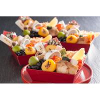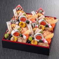 【一の重】田作り、伊達巻、真鯛きずし、味付高野(海老)、味付高野(ほうれん草)、ばい貝旨煮、一口昆布巻、若桃甘露、カニマリネ、数の子、いくら(手まり陶器入り)、海老旨煮、紅白市松かまぼこ、赤魚酒粕焼、黒豆、寿 栗甘露煮
