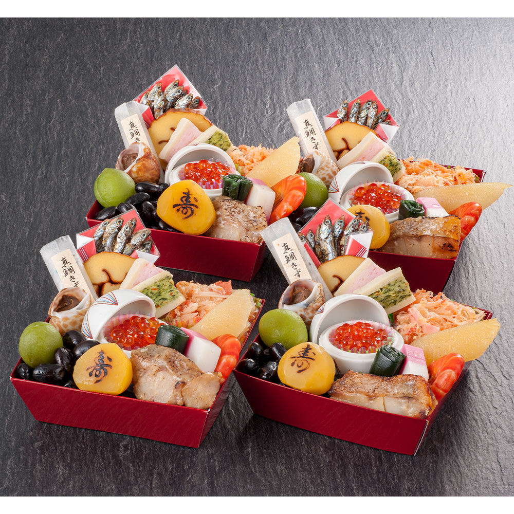 いわれのある食材を使用した1×4人前の和風おせちです。また、赤色の紙カップをそれぞれ取り外して食卓を囲んでいただけます。※オンラインストアのみの承りとなります。(高島屋各店でのお取り扱いはございません。)