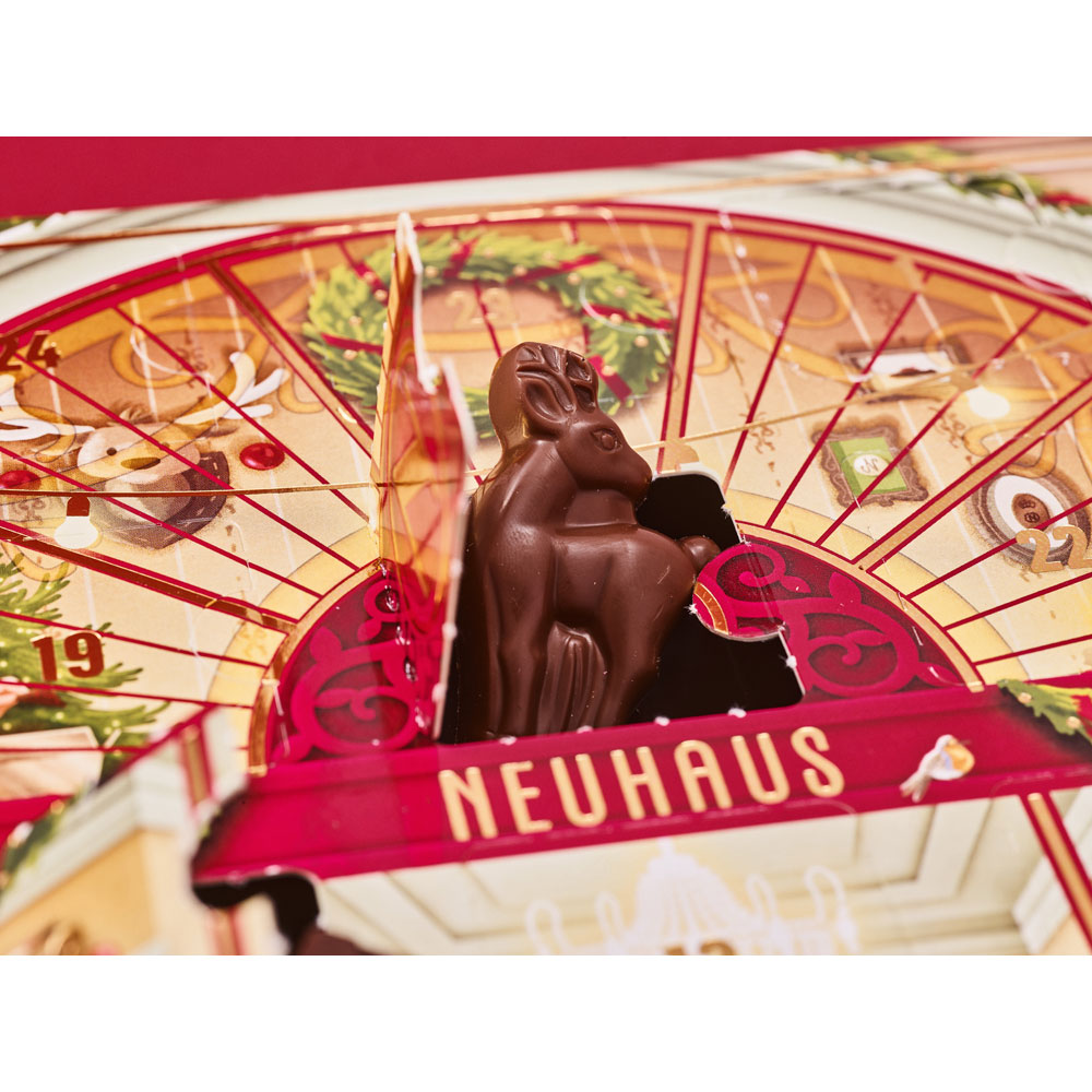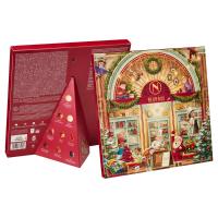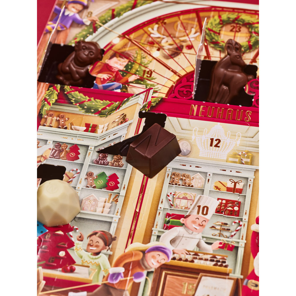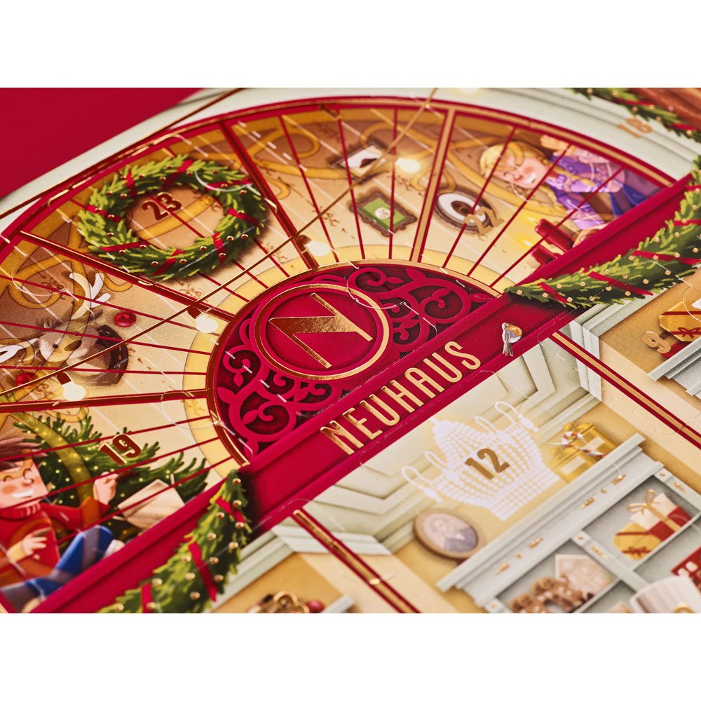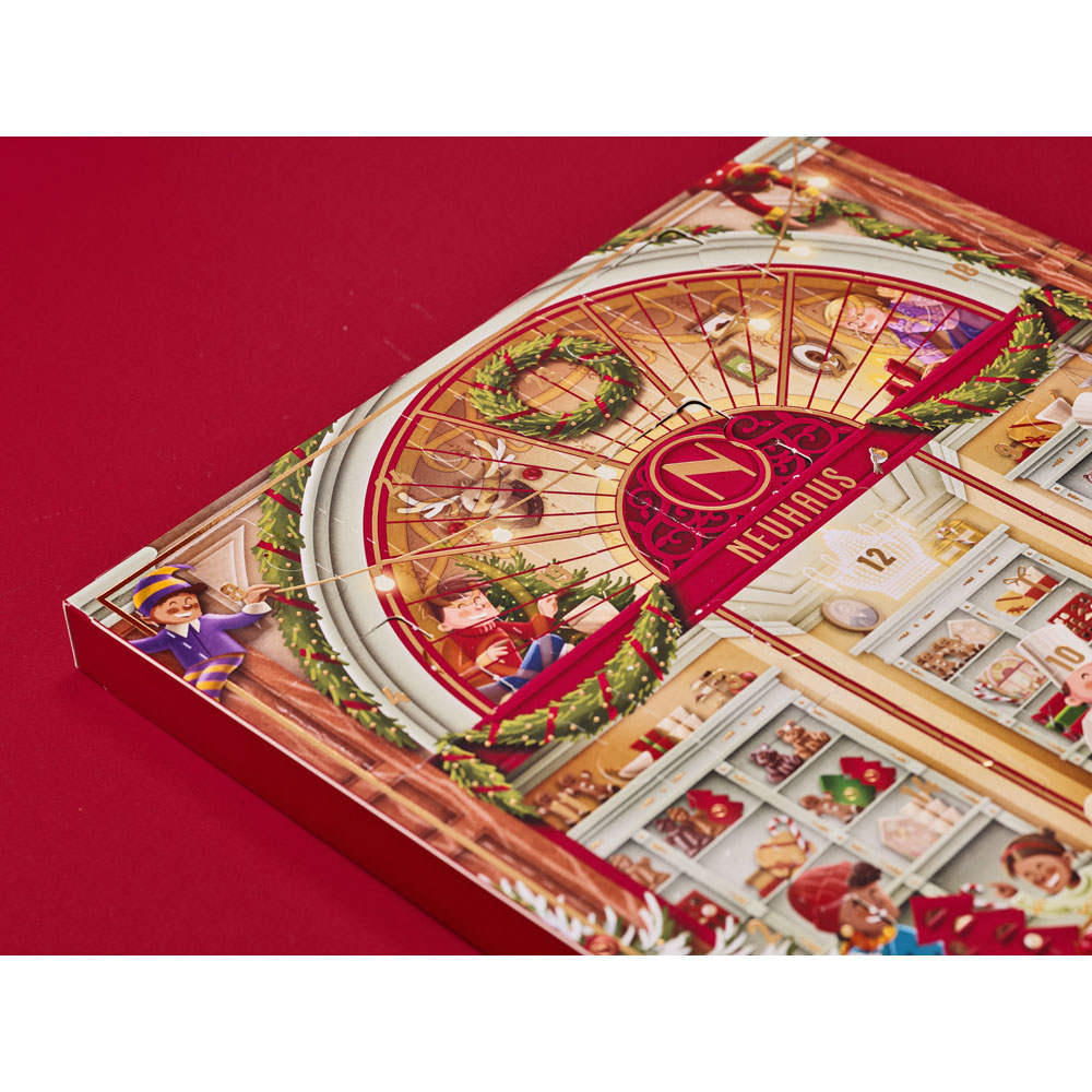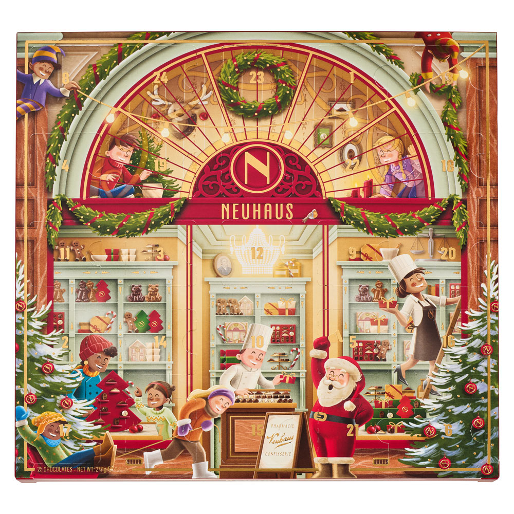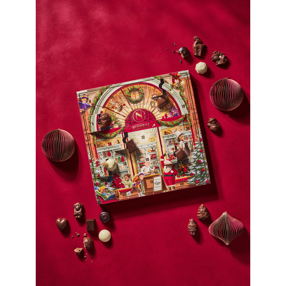 ノイハウスのブティックが彩られた、どこか懐かしく愛らしいアドベントカレンダー。25個のチョコレートをひとつずつ楽しむたび、心が躍るようなひとときが訪れます。こどもから大人まで笑顔になれる、クリスマスの定番としてふさわしい華やかなカレンダーです。