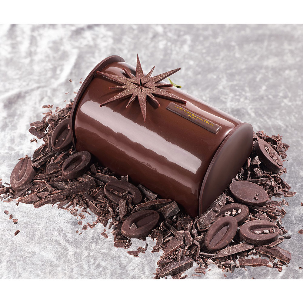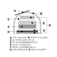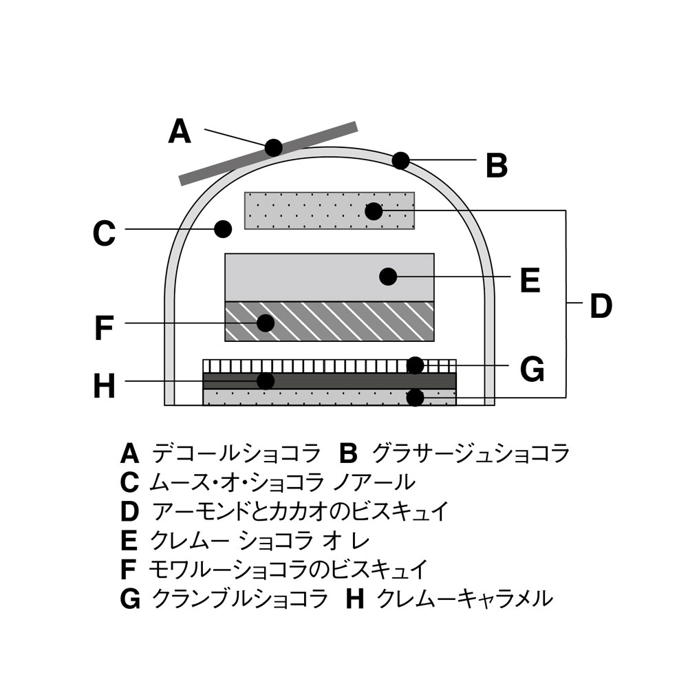 ドミニカ共和国産のカカオを使用した、濃厚なムース・オ・ショコラ ノアールと口当たりなめらかなクレムーショコラオレテクスチャーの違う2種類のビスキュイと、ほのかな苦みがアクセントのクレムーキャラメル、サクサクした食感が特徴のクランブルショコラ様々なショコラのパーツを組み合わせたLMDCならではの、ショコラ尽くしのビュッシュ