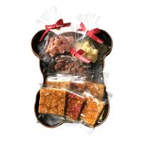 胸の赤いハートがキュートなベア缶。表面は立体的でディテールにもこだわりました。缶はアフターユースとして、小物入れにもお使いいただけます。缶の中には、可愛らしいミニベアのチョコレートと、現代風に薄く仕上げたスペインの伝統アーモンド菓子「トゥロン」をお入れしております。甘さの中でココナッツの華やかな香りが際立つミルクチョコレートベースの「キャラメル トゥロン ココナッツ」、アーモンドとヌガーが織りなす甘さに塩味がアクセントになっているブロンドチョコレートベースの「キャラメル トゥロン ソルト」、ホワイトチョコをベースにした「キャラメル トゥロン フルーツ」の3種類をお楽しみいただけます。