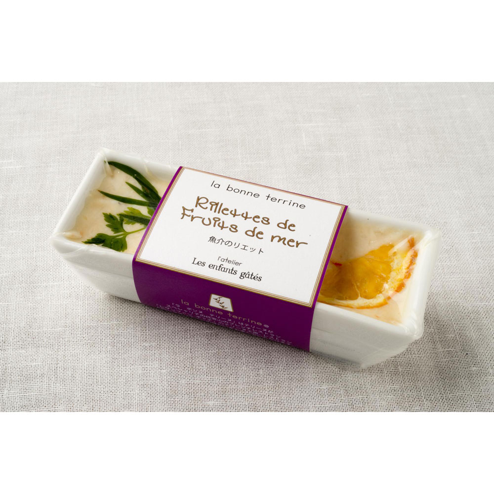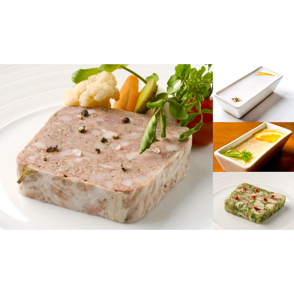 田舎風テリーヌ(80g)1枚、地鶏と豚足のテリーヌ(80g)1枚、魚介のリエット(70g)1個、合鴨のコンフィのリエット(70g)1個