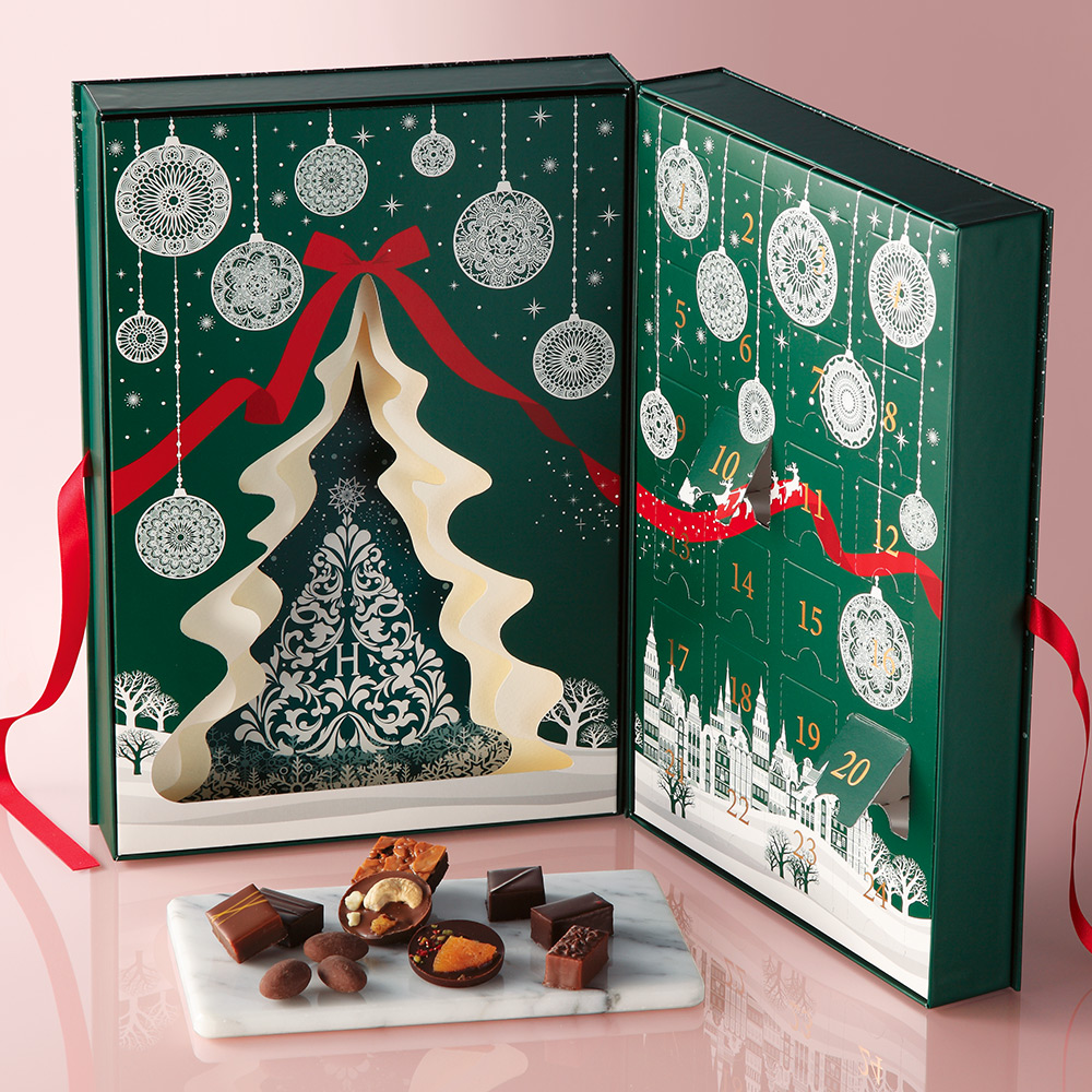ショコラで楽しむ24日間のカウントダウン。1から24までの小窓にル ショコラ ドゥ アッシュを代表するボンボンショコラやひと口サイズの焼菓子を入れました。