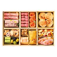 聖夜の晩餐を華やかに彩る〈シェ松尾〉のオードヴル・ヴァリエ。黒毛和牛のローストビーフ、スモークサーモンなどおいしい口福の詰め合わせです。
