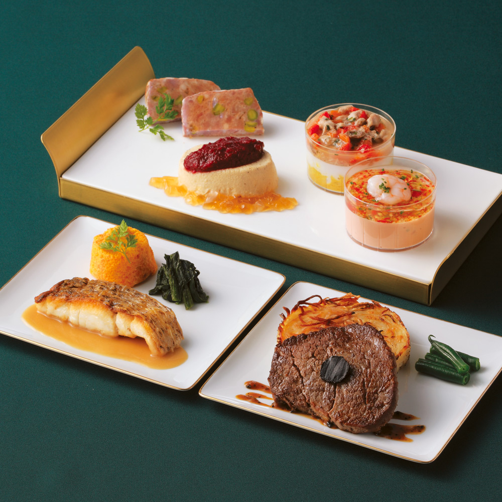 国産牛フィレステーキ ペリグーソース・真鯛のソテー ノイリープラットソース 人参フラン添え・フォアグラのムース・合鴨テリーヌ・小海老のゼリー寄せ・まぐろのシャルトルーズ各2