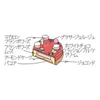アーモンドケークを土台にフランボワーズムースを重ね、パッションフルーツを加えたホワイトチョコレートで包みました。赤いグラサージュでコーティングして、フランボワーズのマカロンなどを飾り、クリスマスらしさを演出しました。