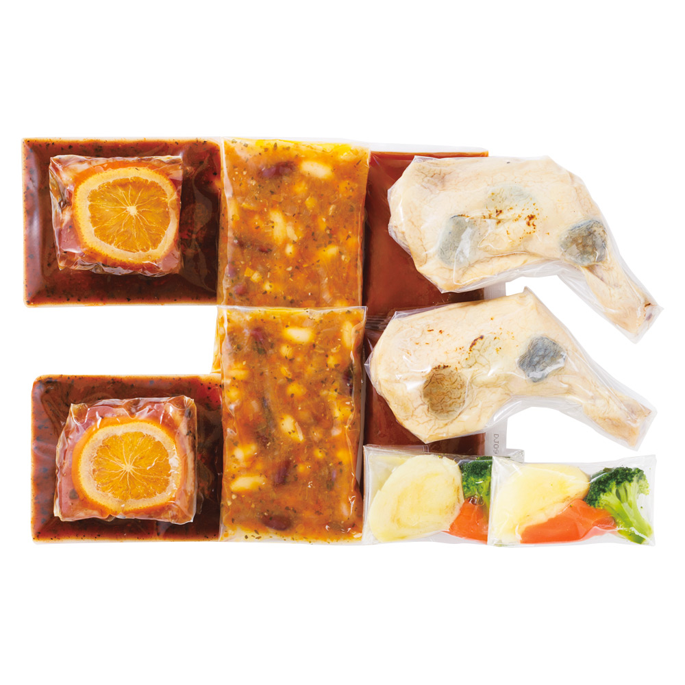 ローストチキンレッグ120g・野菜30g・トリュフソース40g・合鴨のコンフィとオレンジ90g・豆の煮込み90g・オレンジのソース60g各2 ※一部の離島・配達不可地域はお届けできません。