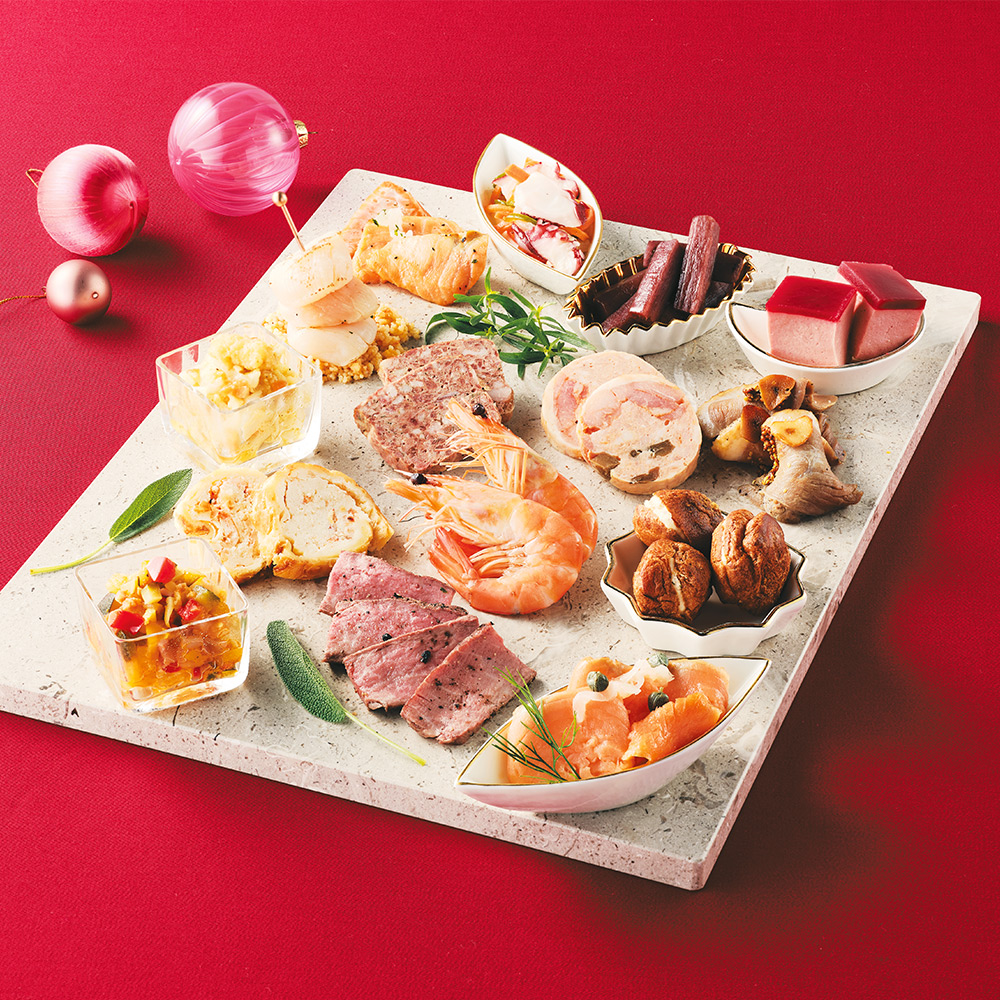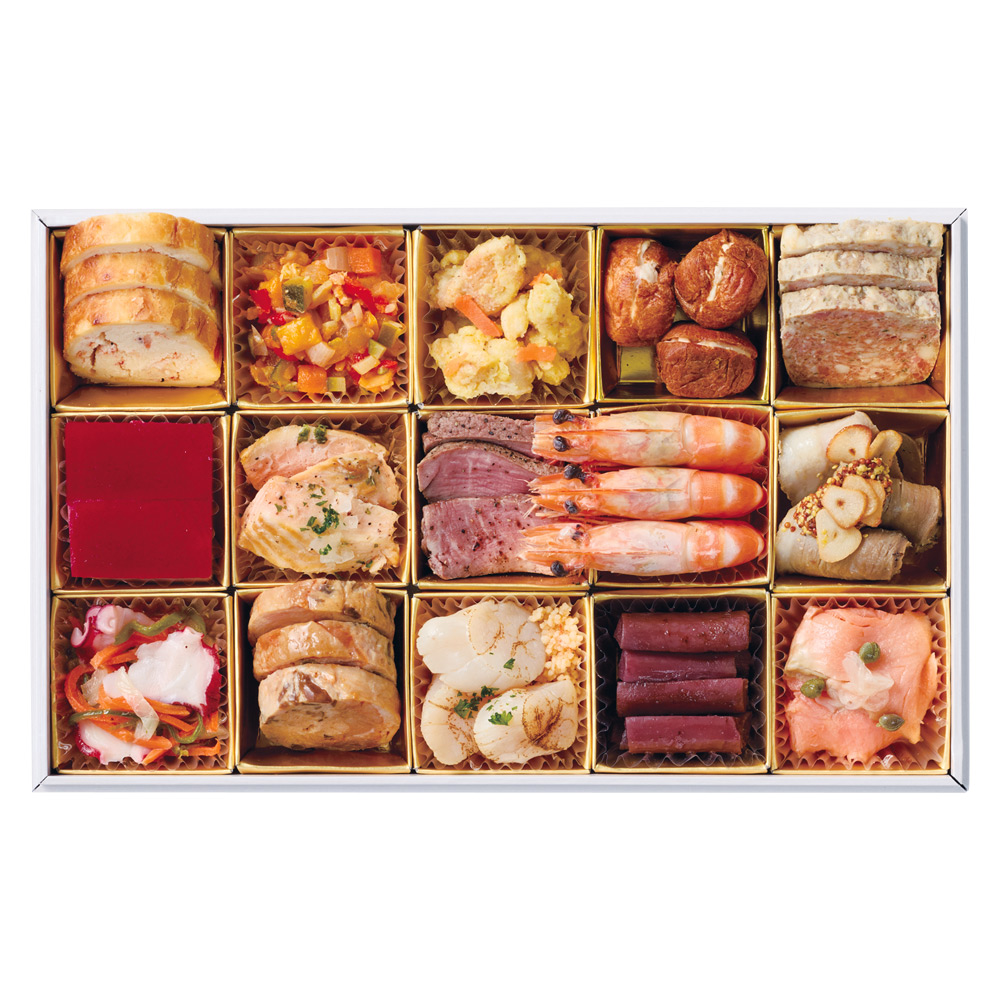 桜エビのパイ包み、チキンと茸のガランティーヌ、天使海老の和風仕立て、蛸のマリネ、白身魚のエスカベッシュ、ゴボウの赤ワイン煮、フランボワーズのムース、コールドビーフ、パテ ド カンパーニュ、他6種 ※一部の離島・配達不可地域はお届けできません。