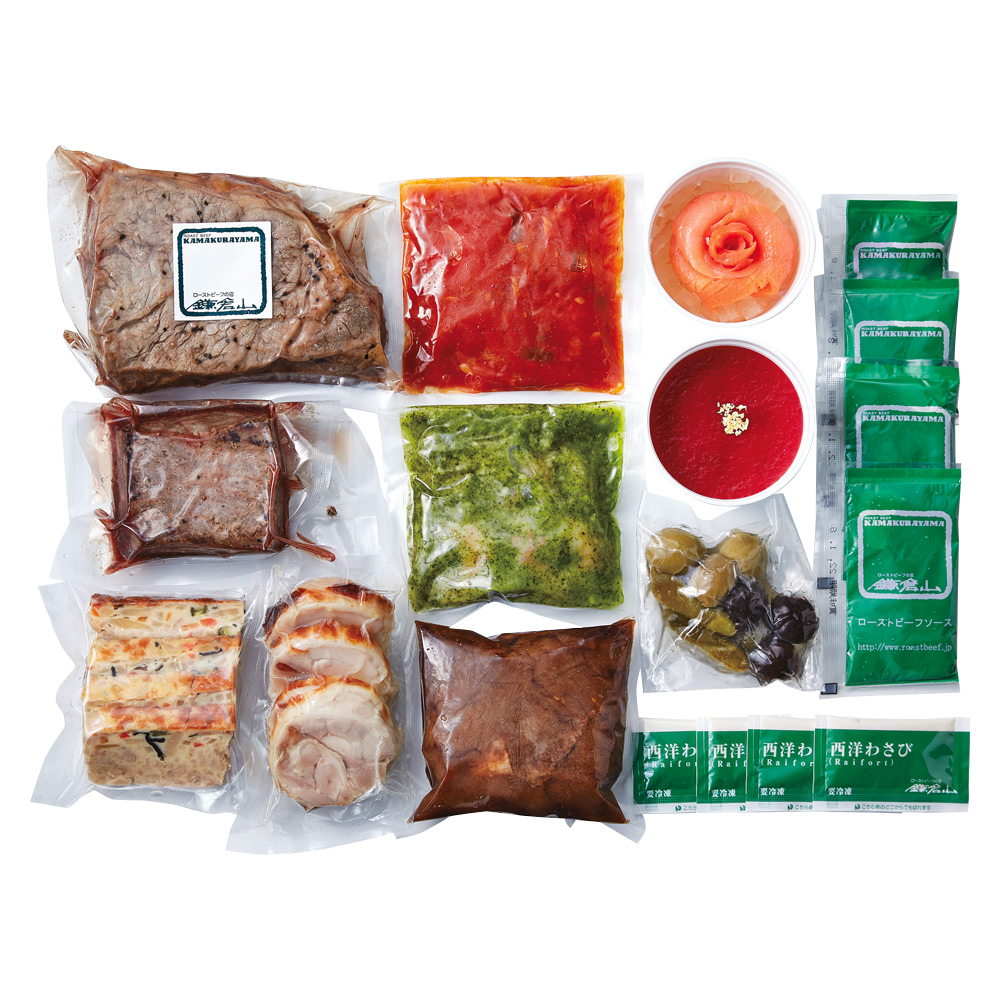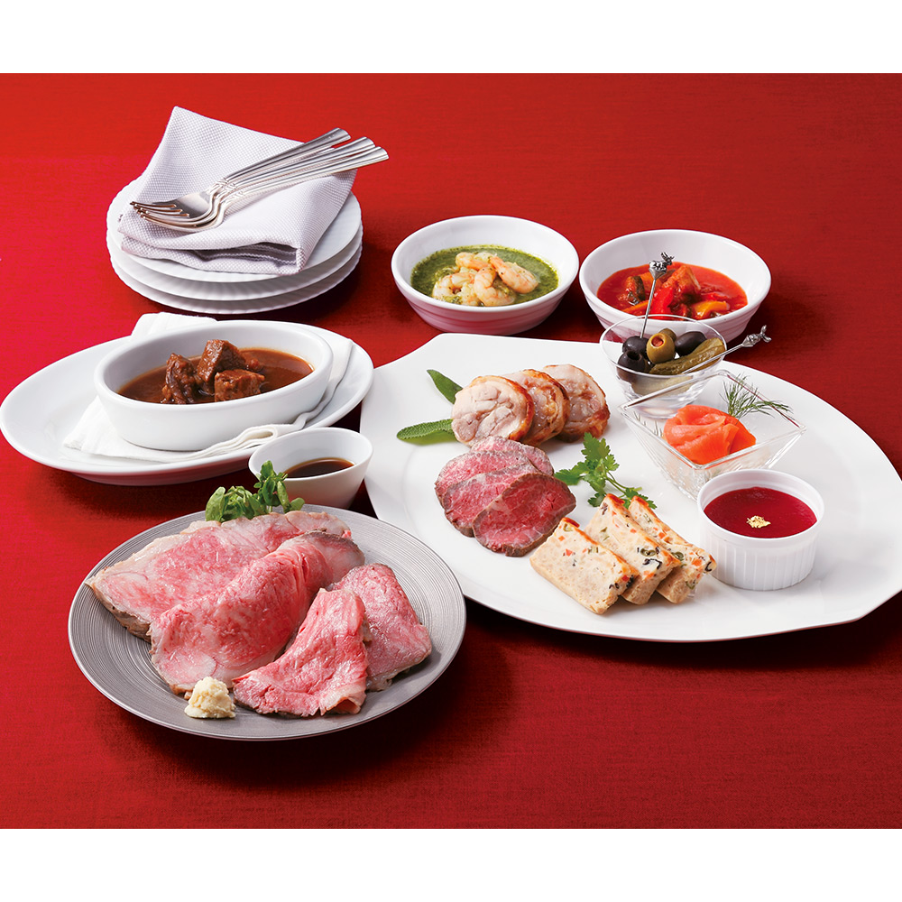 〈ローストビーフの店 鎌倉山〉の前菜をはじめ、サーロイン、モモ肉の2種類のローストビーフなどが楽しめるクリスマスディナーセット。