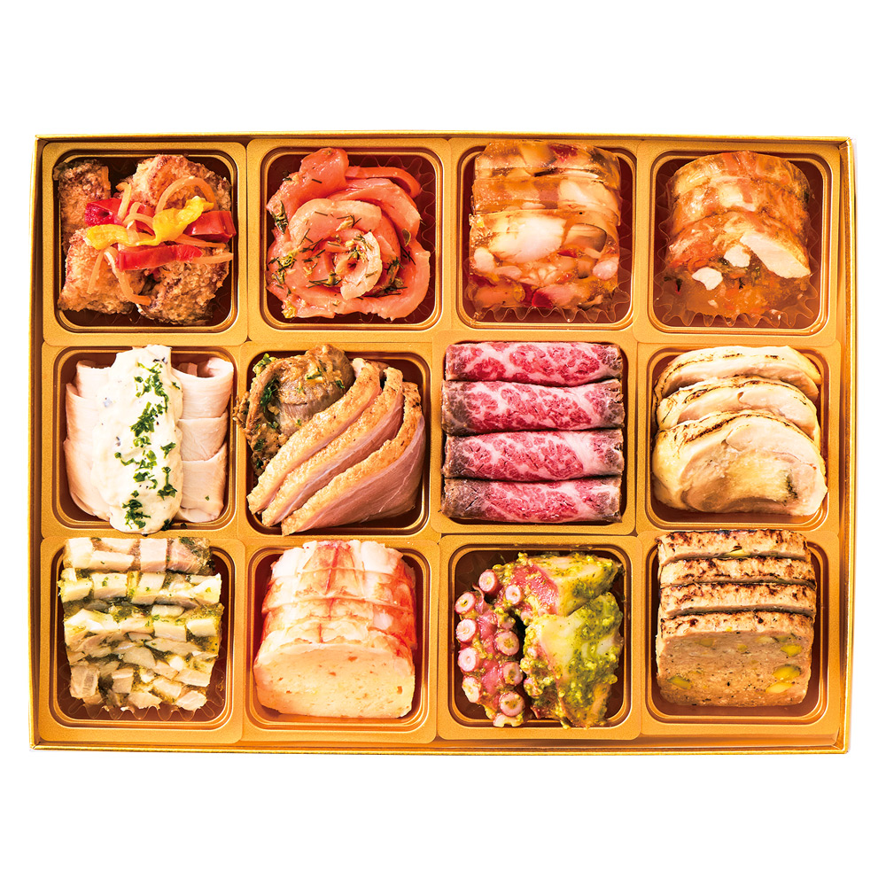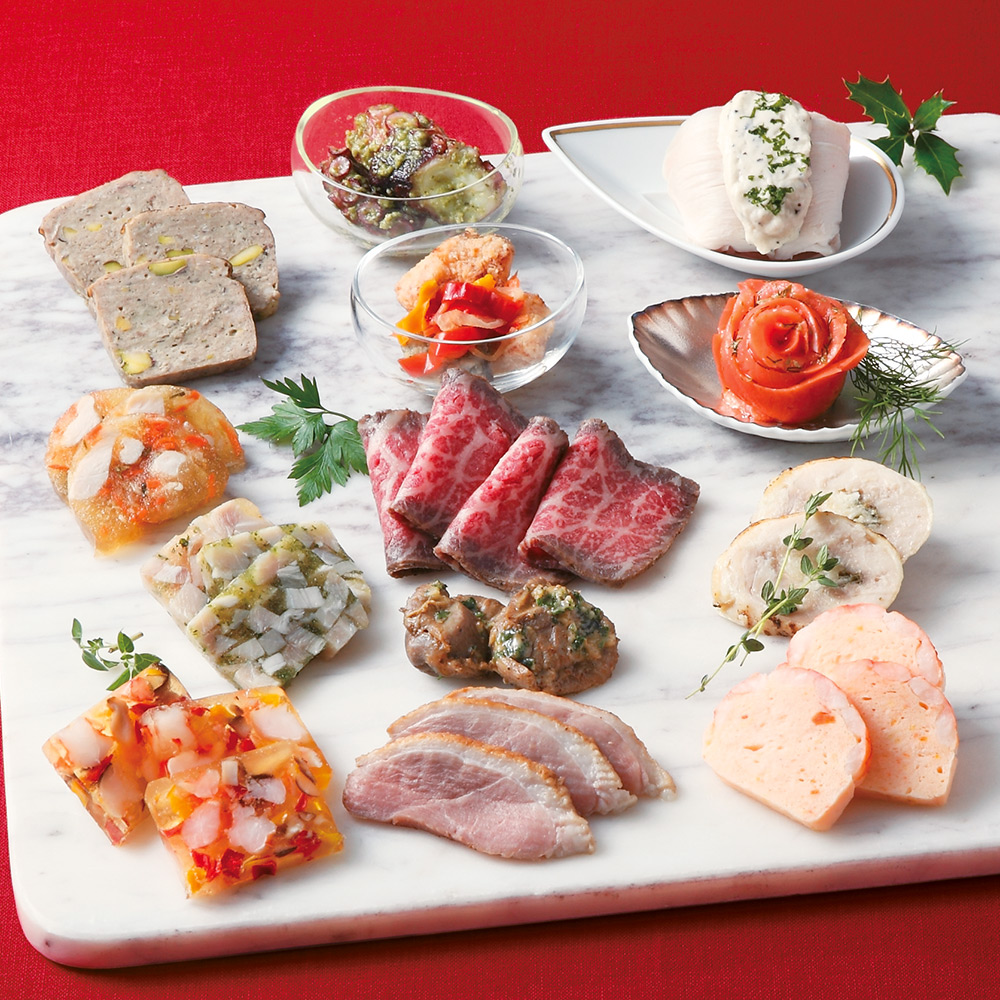 スズキのエスカベッシュ、蒸し鶏のトリュフマヨネーズ、ジャンボンブランペルシエ、スモークサーモントラウトディル風味、砂肝のコンフィ、合鴨のコンフィ、海老のテリーヌ、シュリンプアスピック、国産黒毛和牛の和風ローストビーフ、タコのバジルソース、他3種 ※一部の離島・配達不可地域はお届けできません。