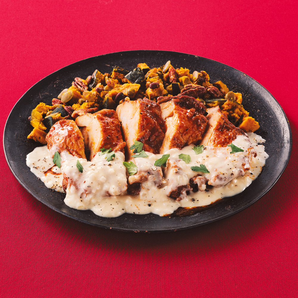 ケイジャンチキンのロースト240g、ローストかぼちゃ&マルチグレインサラダ150g、レモンクリームソース50g ※一部の離島・配達不可地域はお届けできません。