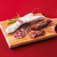 鹿児島県産黒豚モモ肉と国産豚バラ肉を合わせ、約1ヶ月熟成させた白かび熟成の乾燥ソーセージとチョリソの乾燥ソーセージのセット。