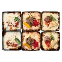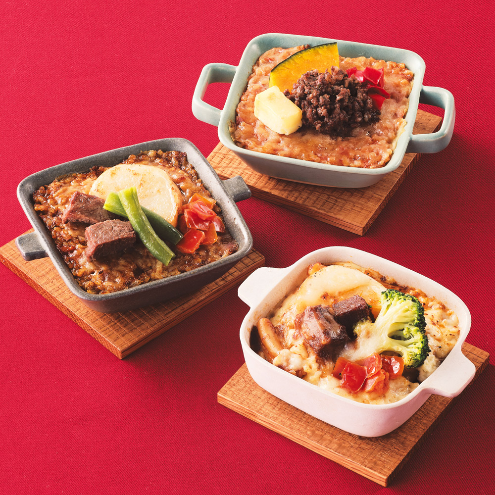 黒毛和牛の角切り肉やそぼろ肉を彩り野菜とともにトッピングした焼きカレー・ドリア・グラタンのセットです。