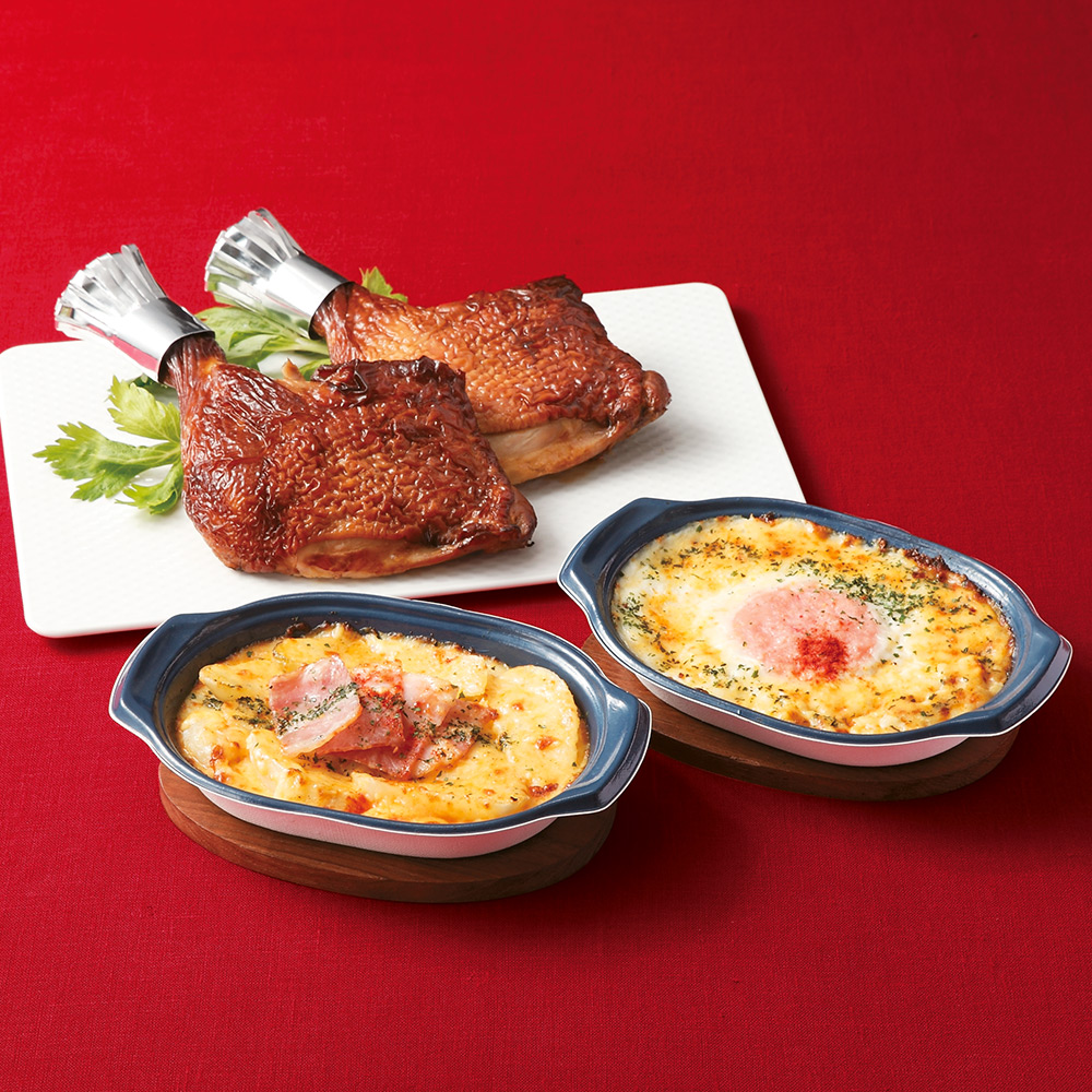 人気のポテトとベーコンのグラタンに、国産鶏の照り焼きチキンと紅ずわいがにのドリアをセットに。