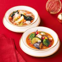 可愛いパッケージの中に、ごろごろ野菜がたっぷり入ったポタージュスープ。色鮮やかなスープをクリスマスの食卓に添えて。