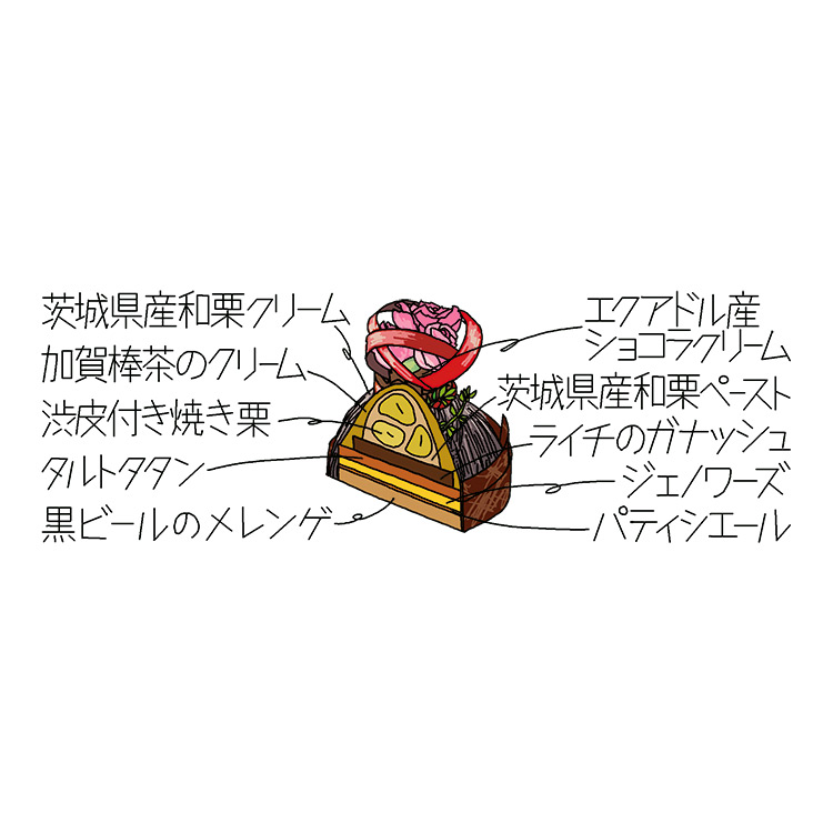 黒ビール香るビターなメレンゲを土台に、茨城県産和栗クリーム、エクアドル産ショコラクリームと薔薇で華やかに飾ったモンブラン。加賀棒茶や芳ばしく焼きしめた林檎で香り豊かに仕上げました。