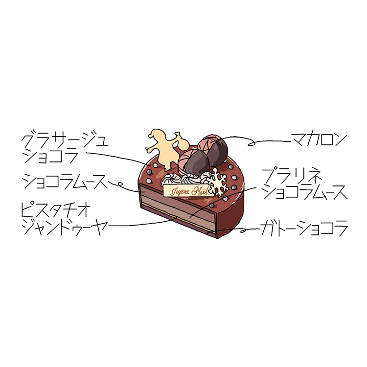 ビターチョコレート、ミルクチョコレートとプラリネのムースや、ピスタチオを使ったジャンドゥーヤ、濃厚なガトーショコラを合わせ、グラサージュショコラで包みました。3種類のチョコレートを使用したスペシャリテです。