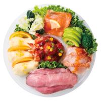 大海老マヨ、ローストビーフとバジルポテトペンネ、金目鯛サラダ、サーモントラウトとオニオンマリネ、イカと胡瓜のねぎ生姜ソース、アボカドのバジルポテトサラダ、ミートボールのトマトソース和え