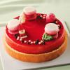アーモンドケークを土台にフランボワーズムースを重ね、パッションフルーツを加えたホワイトチョコレートで包みました。赤いグラサージュでコーティングして、フランボワーズのマカロンなどを飾り、クリスマスらしさを演出しました。