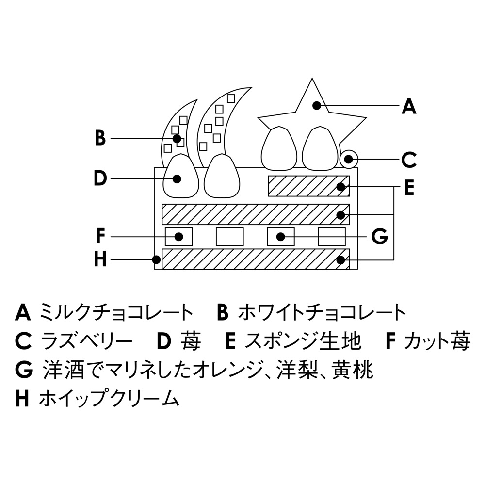 苺やフルーツ、ホイップクリームをふんわり生地に重ね、聖なる夜をイメージさせるお星様とお月様のチョコレートで飾りました。
