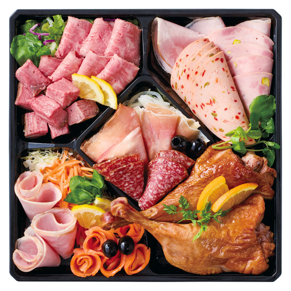 ローストビーフ、カセラーロレ、カイザービアシンケン、パプリカリオナー、ハモンセラーノ、フィラハサラミ、合鴨スモークレッグ、スモークサーモン、他