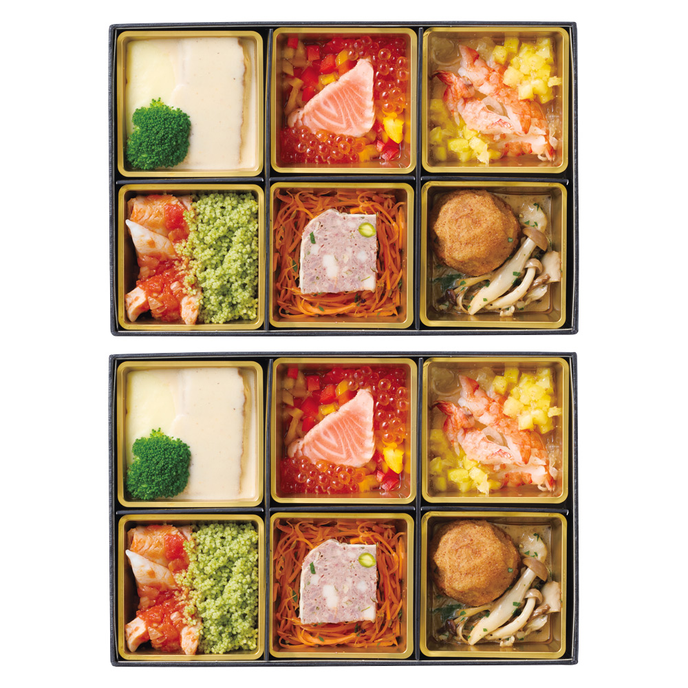 オードブル1段(サーモンとイクラとパプリカのサラダ、エビとパイナップルのセビーチェ、鶏ハムと烏賊のラタトゥイユ仕立てクスクス添え、鴨モモ肉クロケットとキノコのクリーム煮、黒豚のジンジャー煮込み ジャガイモピューレ ブロッコリー添え、パテ・ド・カンパーニュ キャロットラペ)×2