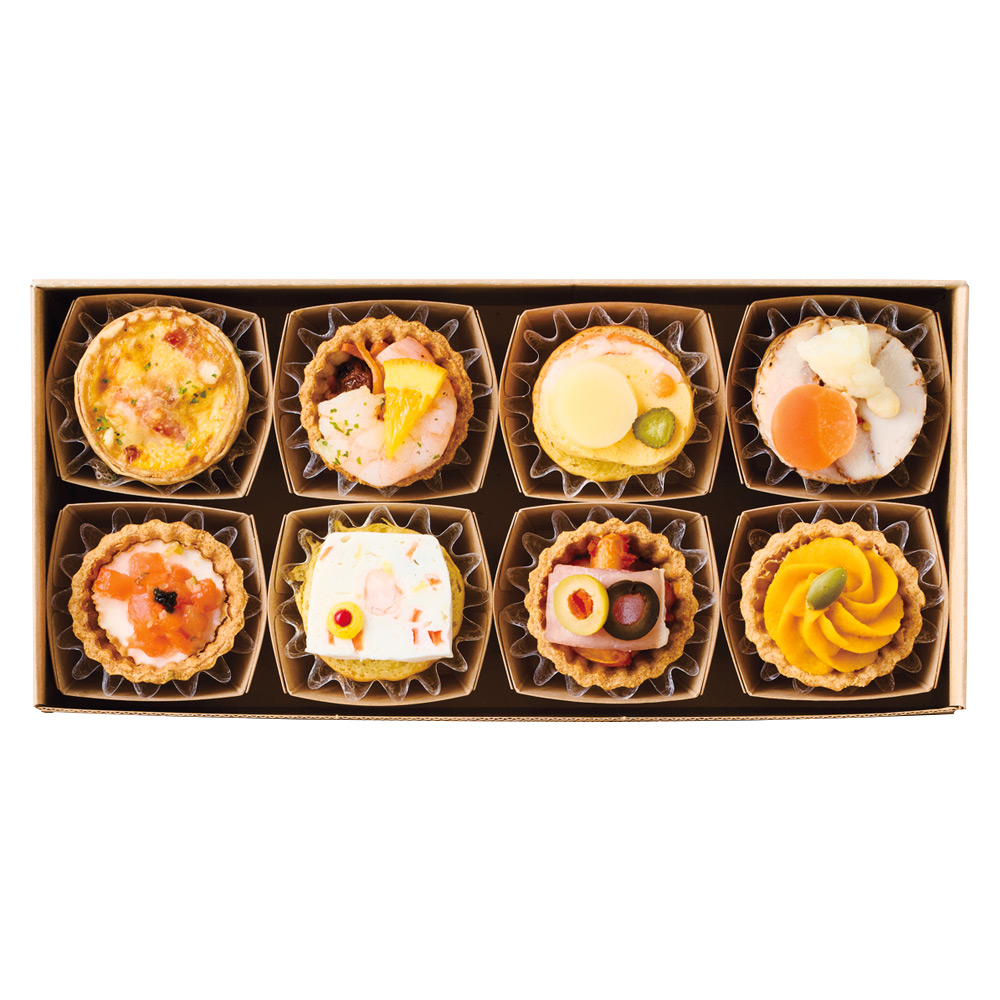 キッシュロレーヌ、海老と人参のマリネ、若鶏の香草焼き、チーズテリーヌ、スモークサーモンのタルタル、南瓜のディップ、生ハムと白いんげん豆煮込み、テリーヌポアソン