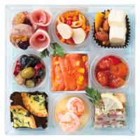 パテ・ド・カンパーニュ、帆立とペンネトマトソース、オリーブ・アンチョビ、サーモントラウトとポテトのサラダ、セミドライトマトのジュレサラダ、海老のカクテル、他5種