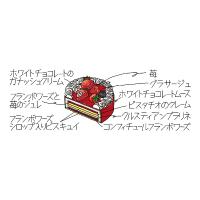 ホワイトチョコレートのムースにフランボワーズと苺のジュレ、ピスタチオのクレーム、アーモンド生地、クルスティアンプラリネを合わせました。