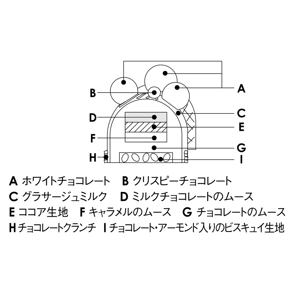 ビターチョコのムースの中に、ミルクチョコとキャラメルムースを閉じ込め、ヘーゼルナッツのプラリネを加えた生地にアーモンドとチョコレートをちりばめました。チョコレートの奥深い味わいをどうぞ。