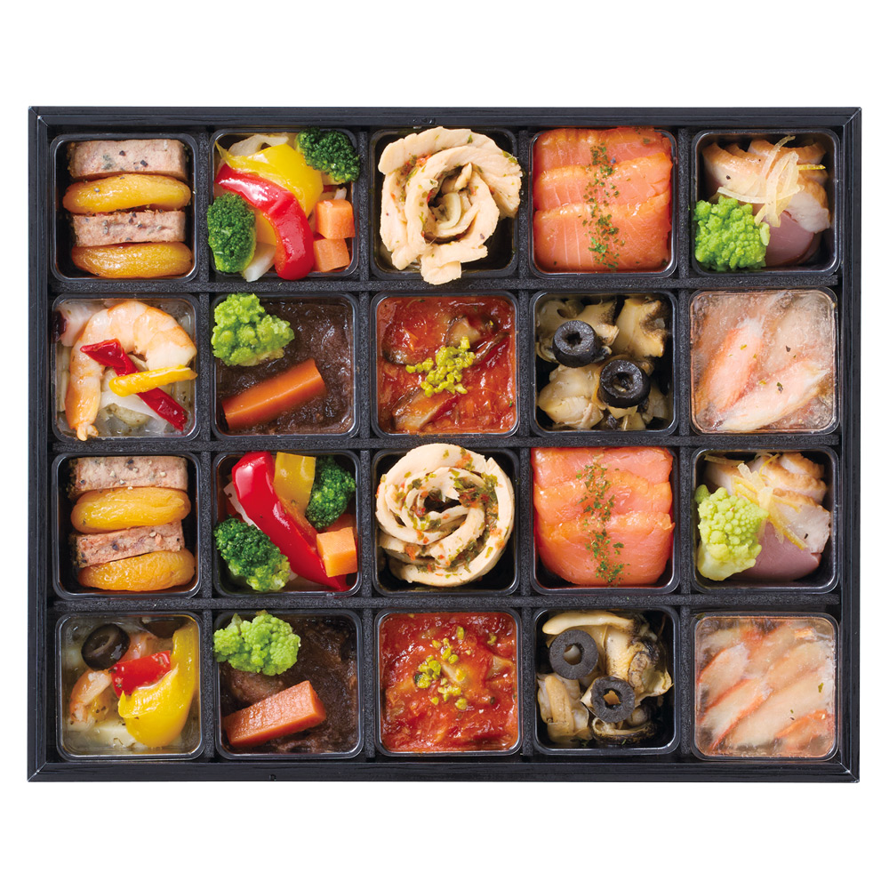 パーティーで人気のひと口サイズのプチオードブルをセットに。10種類の多彩な味わいを2個ずつ詰め合わせた限定オードブル。