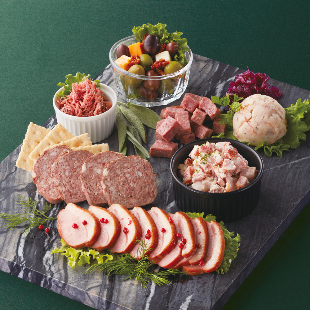 〈千駄木腰塚〉より、人気のコンビーフをはじめ、青森県産鴨ロースマリネやパテ・ド・カンパーニュなど多彩なおいしさをセットに。
