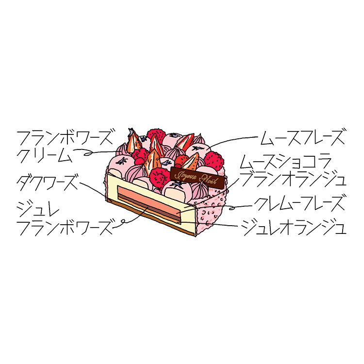 バニラとオレンジのムースに、苺と木苺のジュレとクリームを重ねた華やかなケーキ。香り高いベリー入りのショコラ生地が、軽やかな甘みを引き立てます。